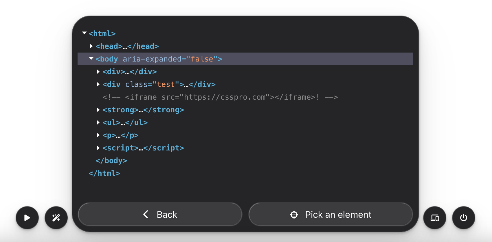 You can also click "Pick an element" to pick elements using your mouse. When this mode is active, as you move the mouse throughout the screen, elements will be focused/highlighted so that you can understand where they are located in the website's structure.